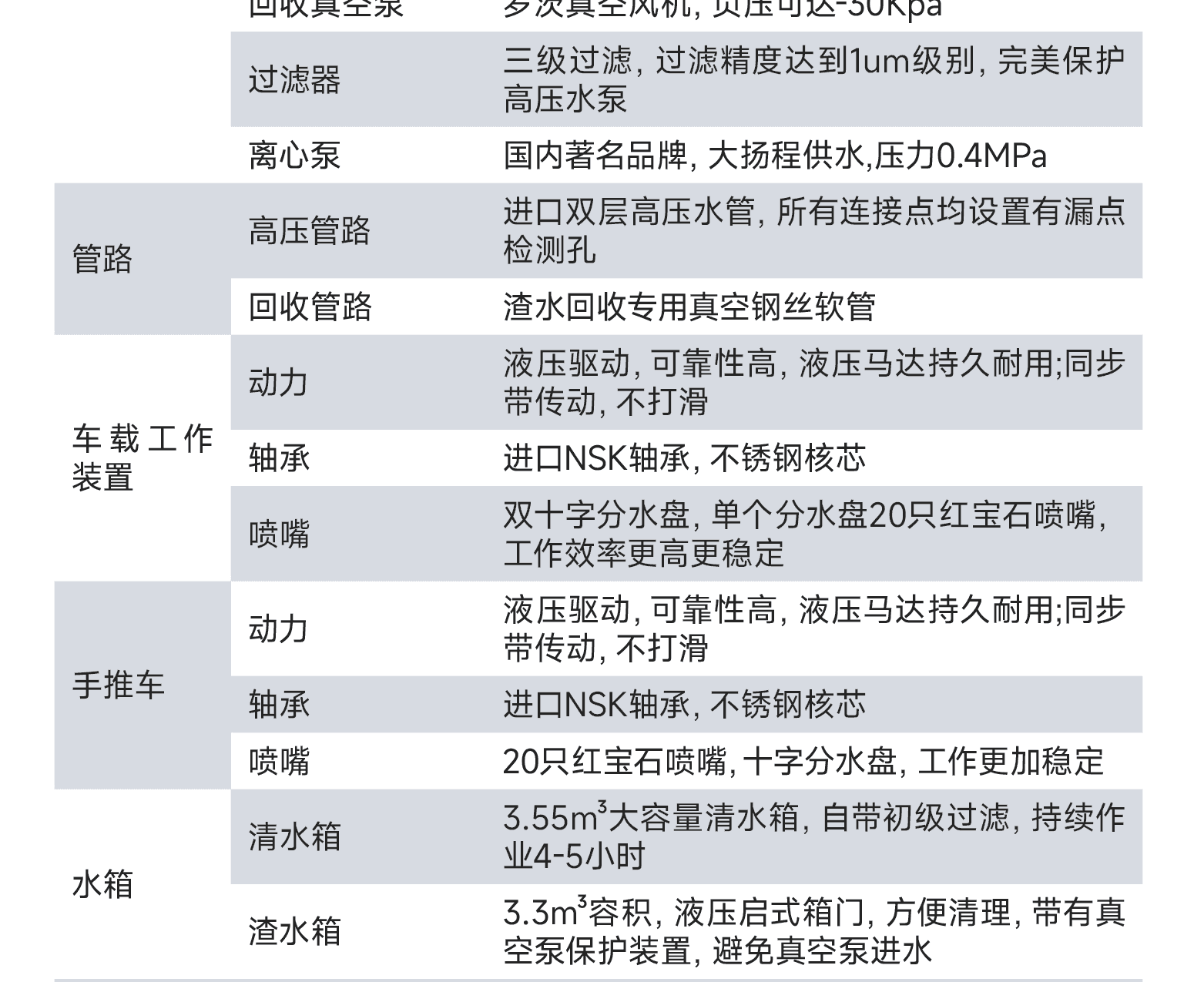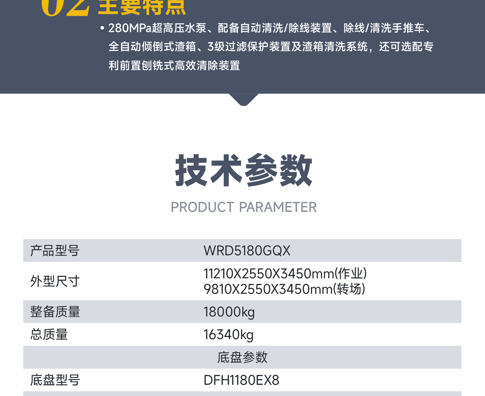 主要特點:280MPa超高壓水泵、配備自動清洗/除線裝置、除線/清洗手推車、全自動傾倒式渣箱、3級過濾保護裝置及渣箱清洗系統