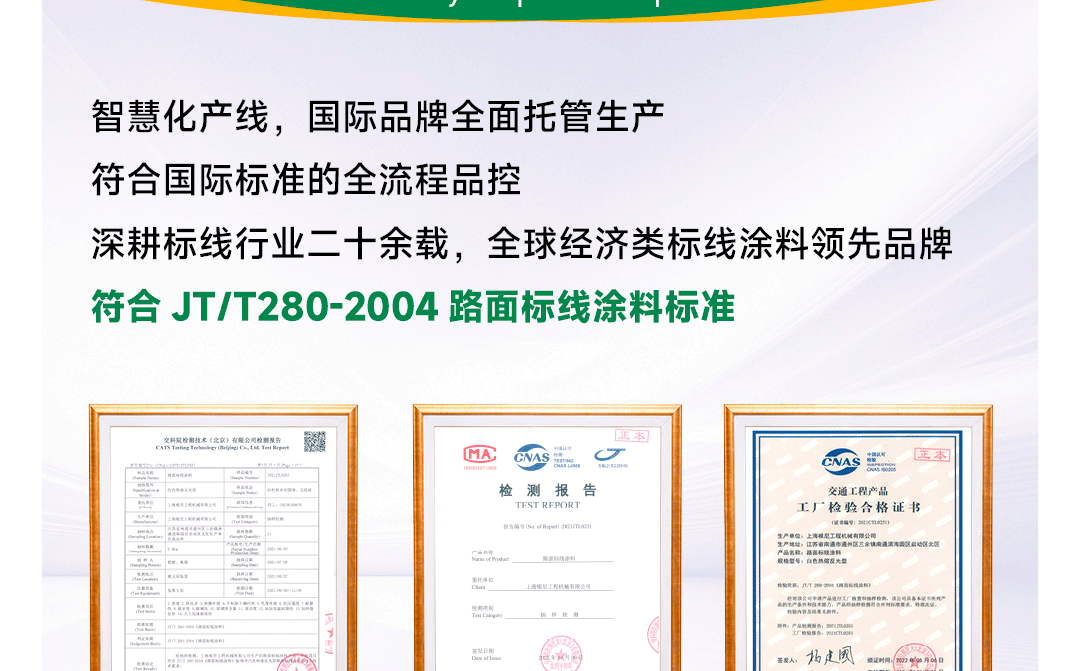 涂料特點:結(jié)構(gòu)合理、混合均勻、質(zhì)量一致性高 / 玻璃珠含量少 / 用途廣泛,使用方便。執(zhí)行標準:符合JT/T280-2004主要標準;