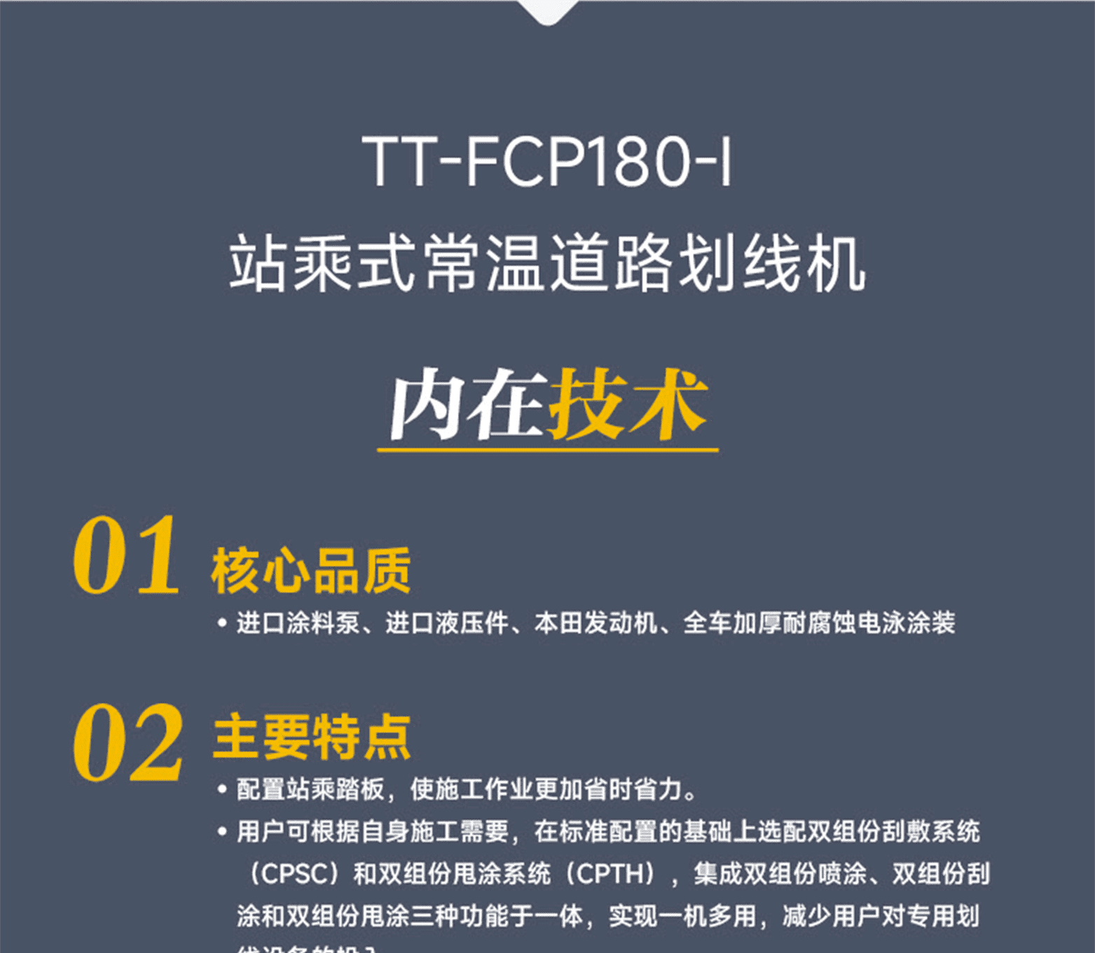 ?專家測評:主要特點:配置站乘踏板,使施工作業(yè)更加省時省力。用戶可根據自身施工需要,在標準配置的基礎上選配雙組份刮敷系統(tǒng)(CPSC)和雙組份甩涂系統(tǒng)(CPTH),集成雙組份噴涂、雙組份刮涂和雙組份甩涂三種功能于一體,實現一機多用,減少用戶對專用劃線設備的投入。