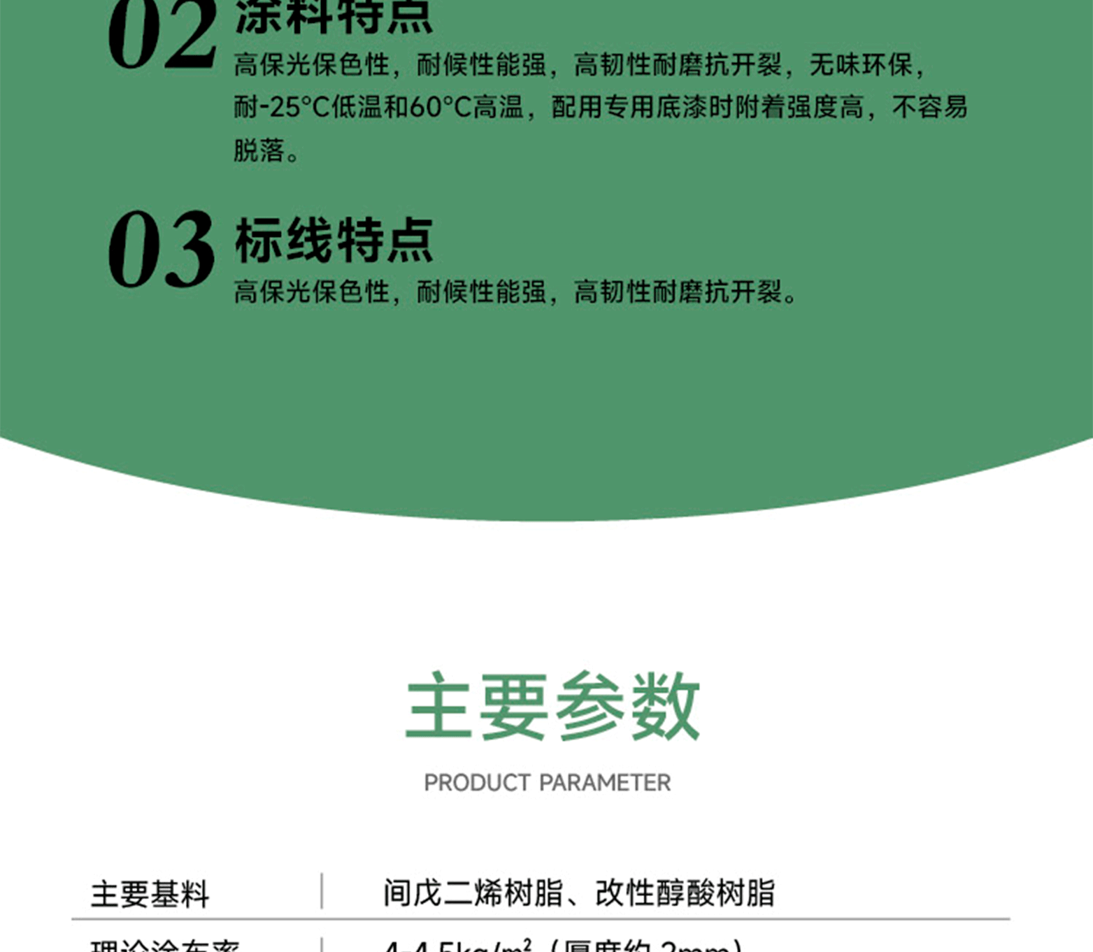 涂料特點:高保光保色性,耐候性能強,高韌性耐磨抗開裂,無味環保,耐-25℃低溫和60℃高溫。標線特點:高保光保色性,耐候性能強,高韌性耐磨抗開裂。