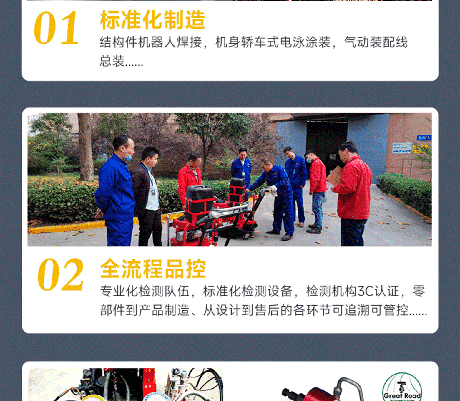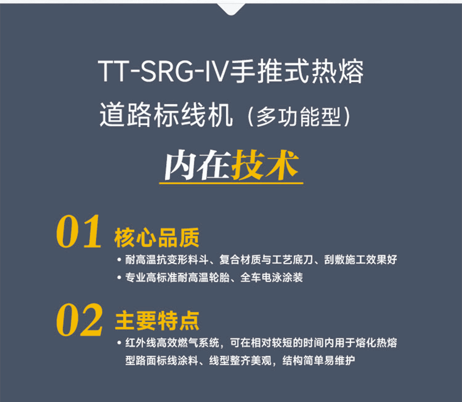 核心品質:耐高溫抗變形料斗、復合材質與工藝底刀、刮敷施工效果好。主要特點:紅外線高效燃氣系統,可在相對較短的時間內用于熔化熱熔型路面標線涂料、線型整齊美觀,結構簡單易維護