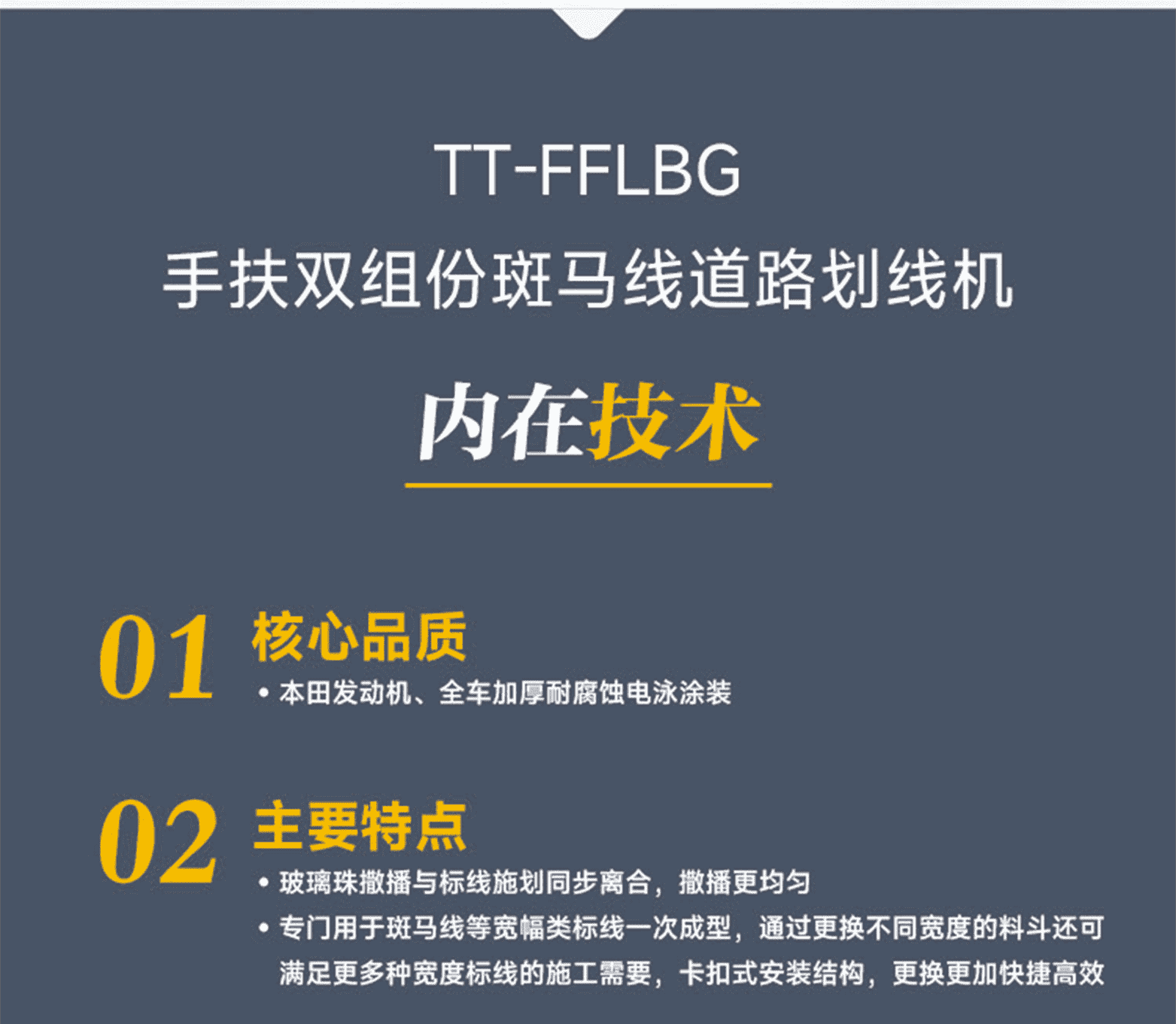 主要特點:玻璃珠撒播與標線施劃同步離合,撒播更均勻。專門用于斑馬線等寬幅類標線一次成型,通過更換不同寬度的料斗還可滿足更多種寬度標線的施工需要,卡扣式安裝結構,更換更加快捷高效
