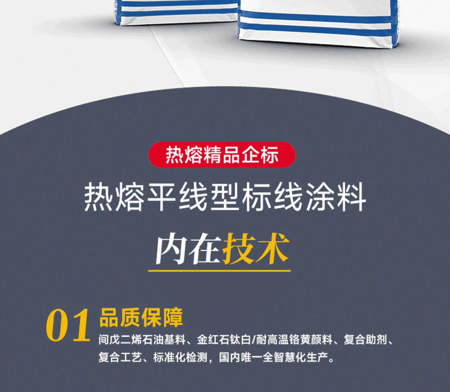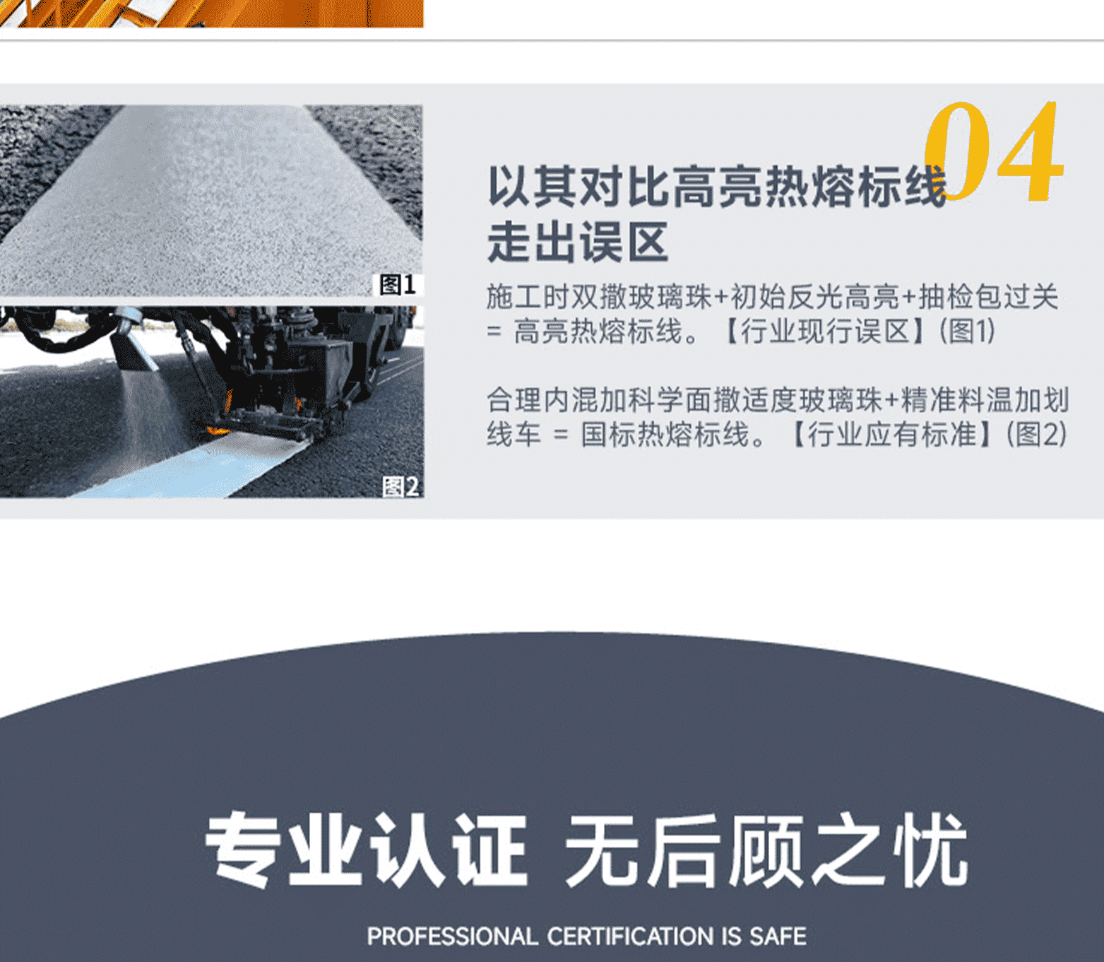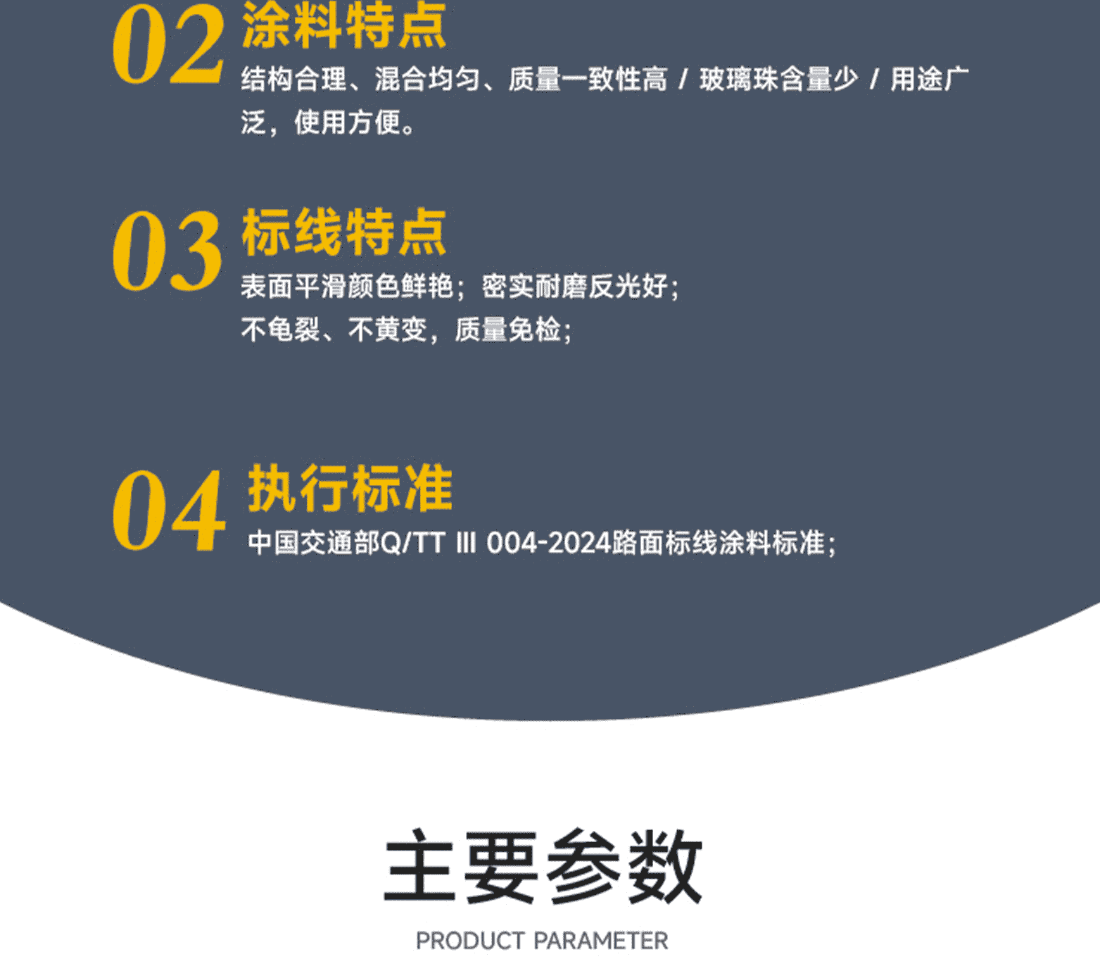 涂料特點:結構合理、混合均勻、質量一致性高 / 玻璃珠含量少 / 用途廣泛,使用方便。標線特點:表面平滑顏色鮮艷;密實耐磨反光好;不龜裂、不黃變,質量免檢;