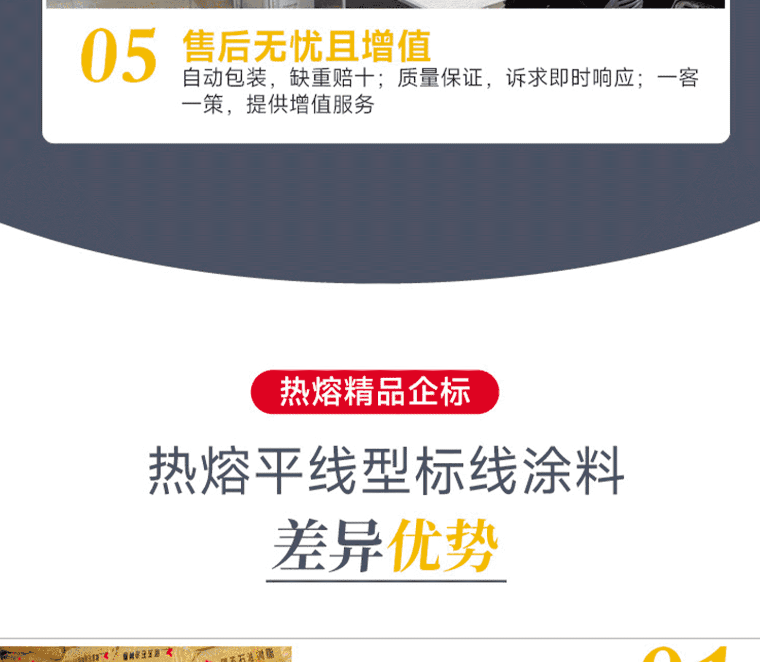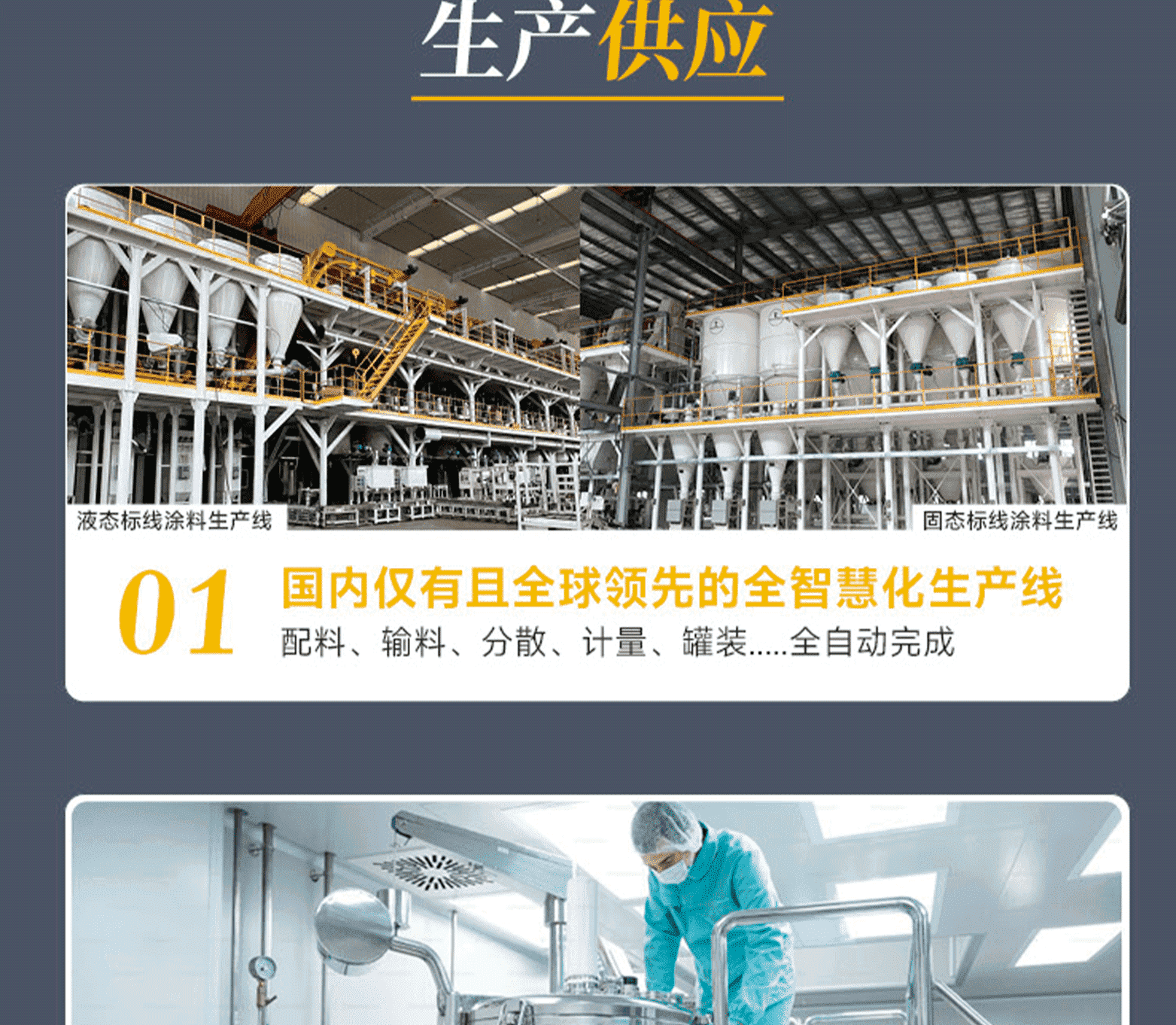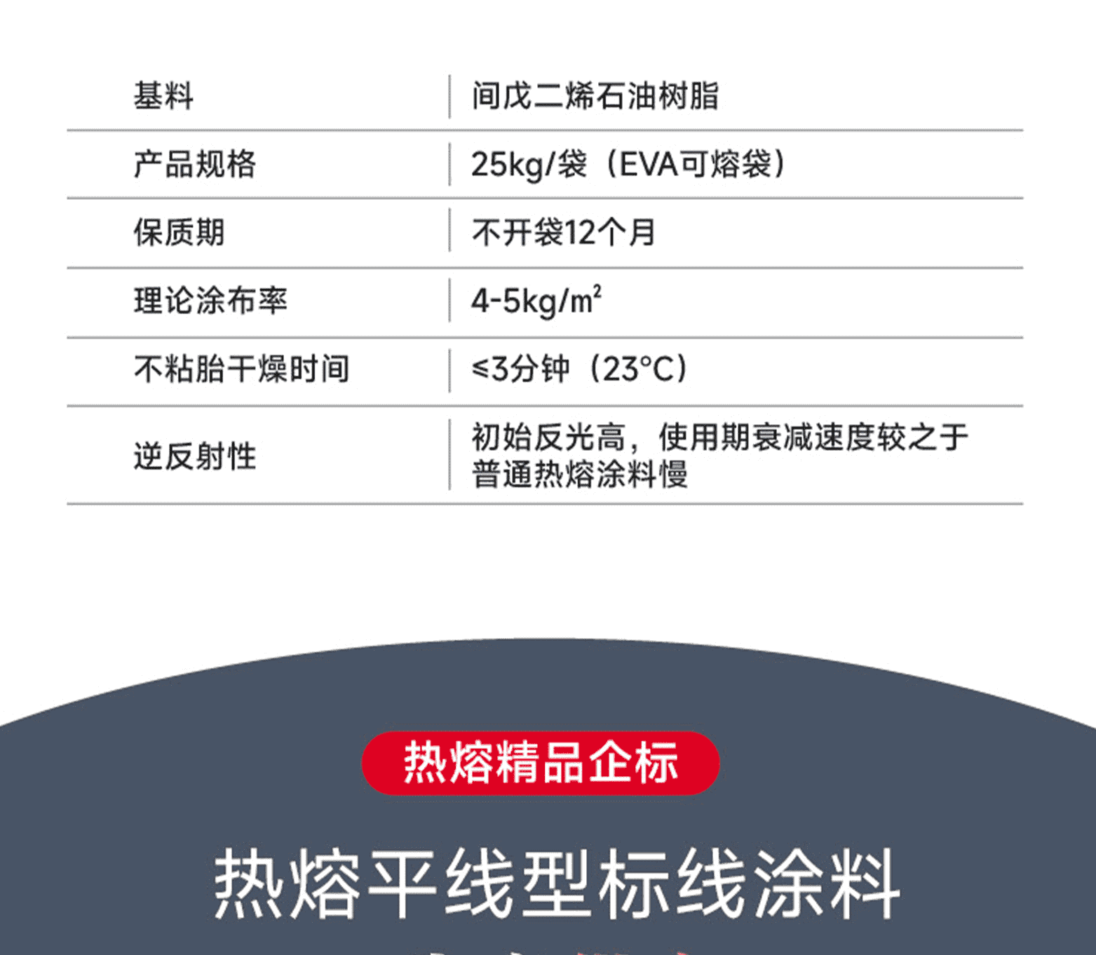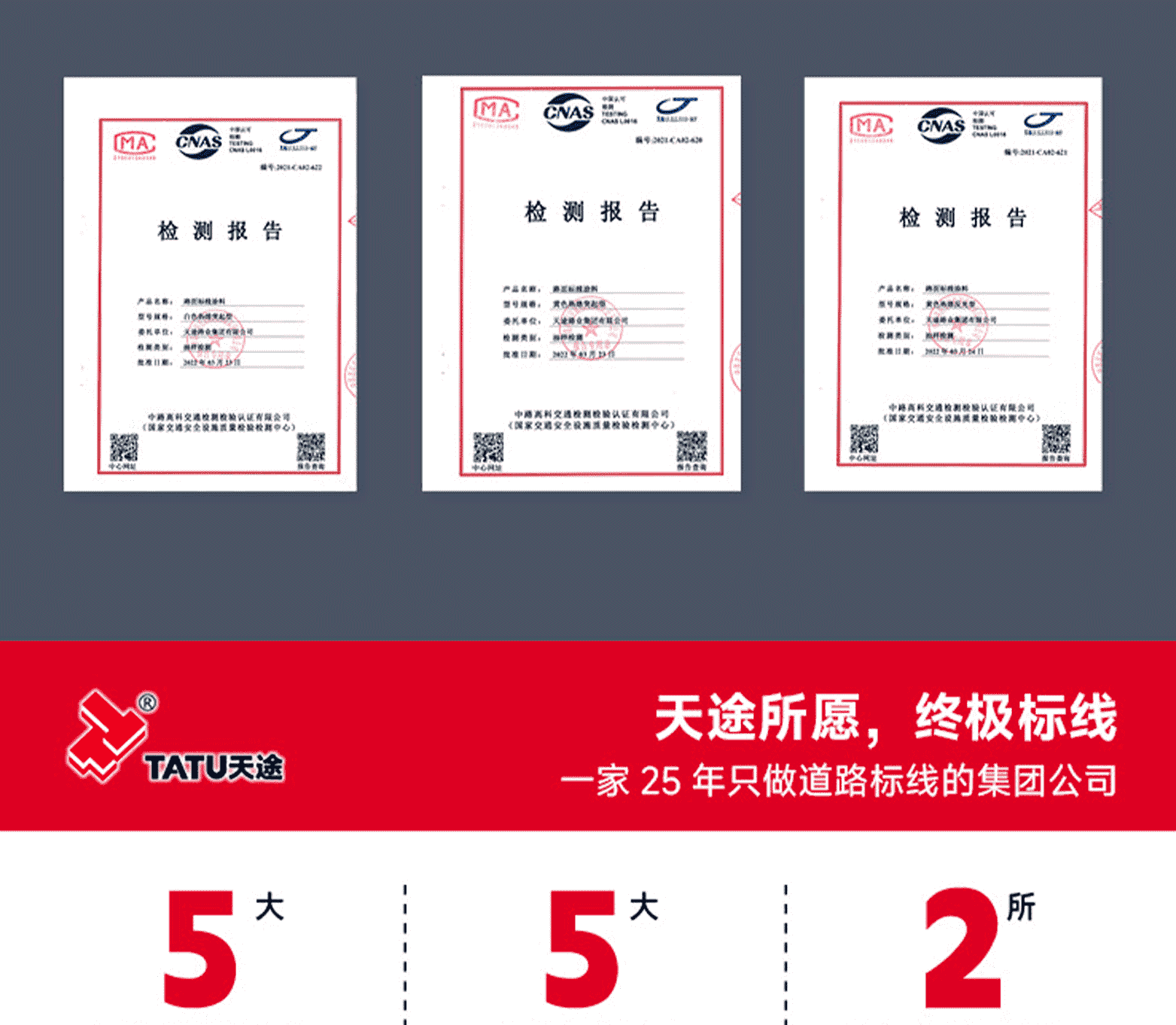 涂料特點:結構合理、混合均勻、質量一致性高 / 玻璃珠含量少 / 用途廣泛,使用方便。標線特點:表面平滑顏色鮮艷;密實耐磨反光好;不龜裂、不黃變,質量免檢;