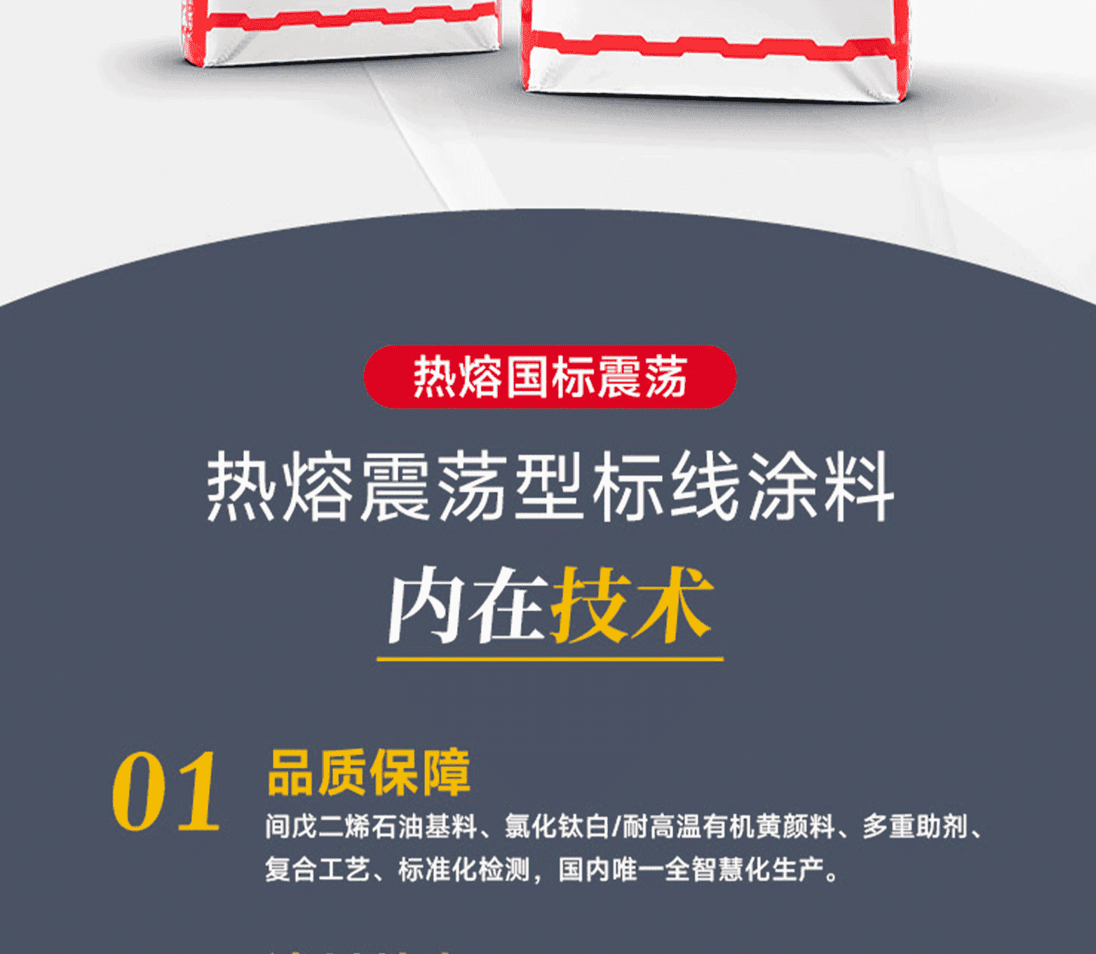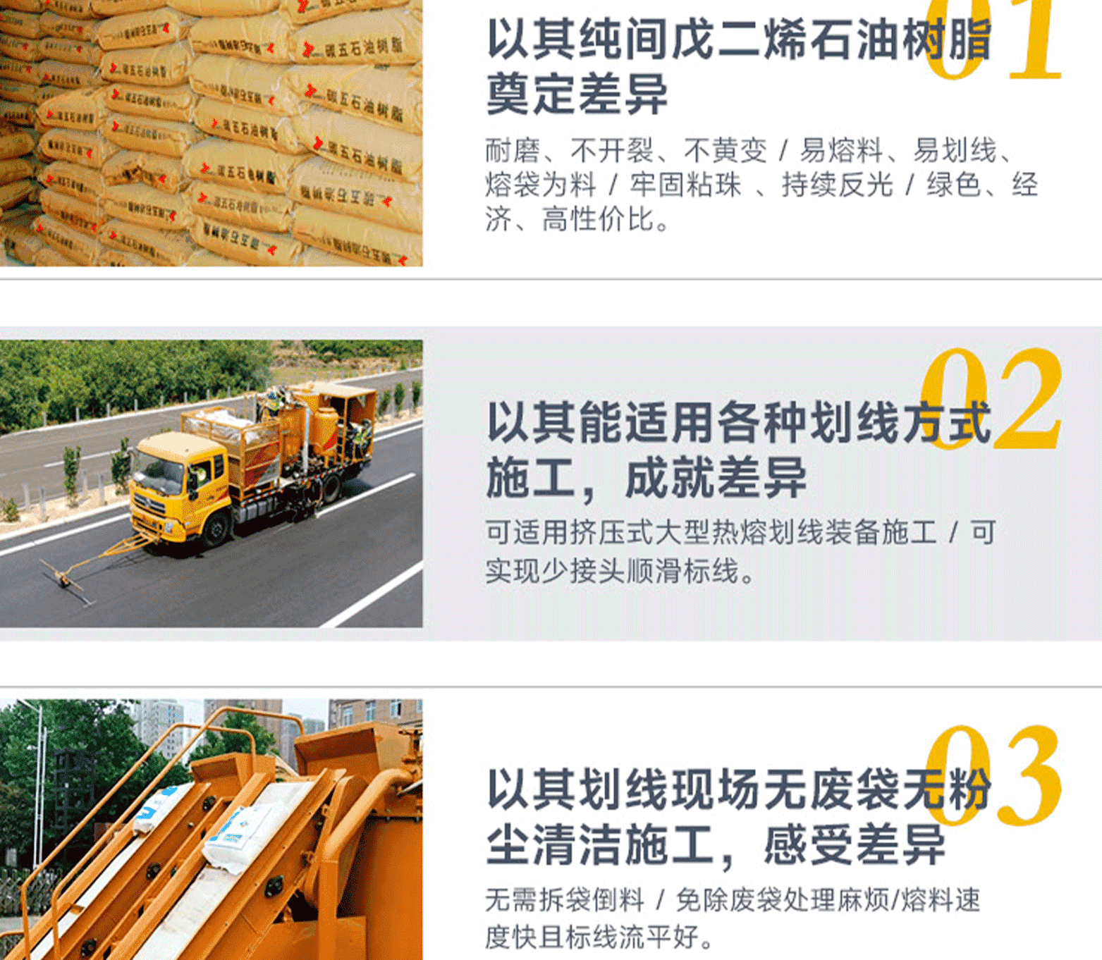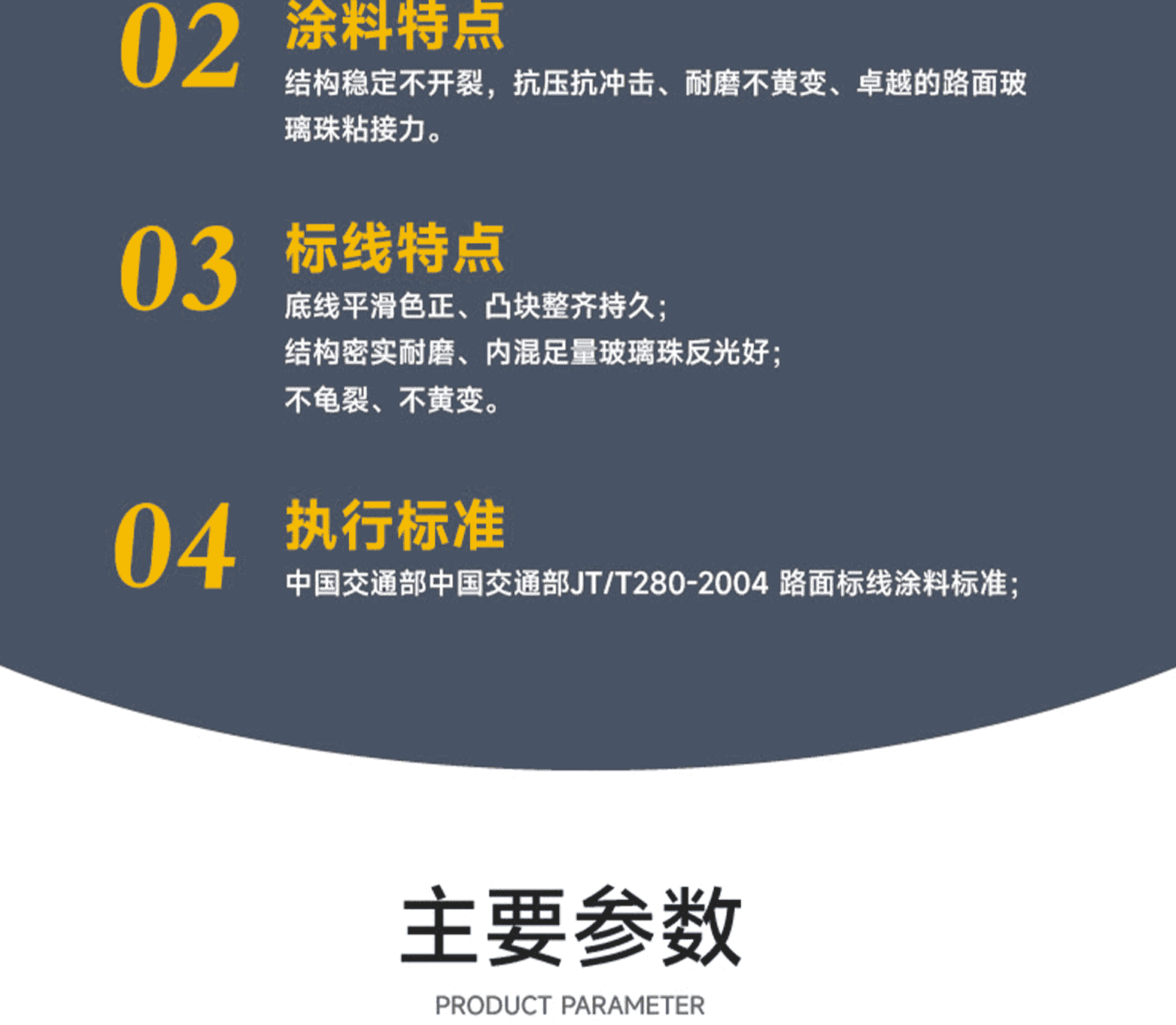 涂料特點:結構密實不開裂,抗壓耐磨不黃變、卓越的識認性、對路面玻璃珠粘接力強。標線特點:表面平滑顏色鮮艷;密實耐磨反光好;不龜裂、不黃變,質量免檢;標線壽命長,是常規熱熔標線的1.6倍。
