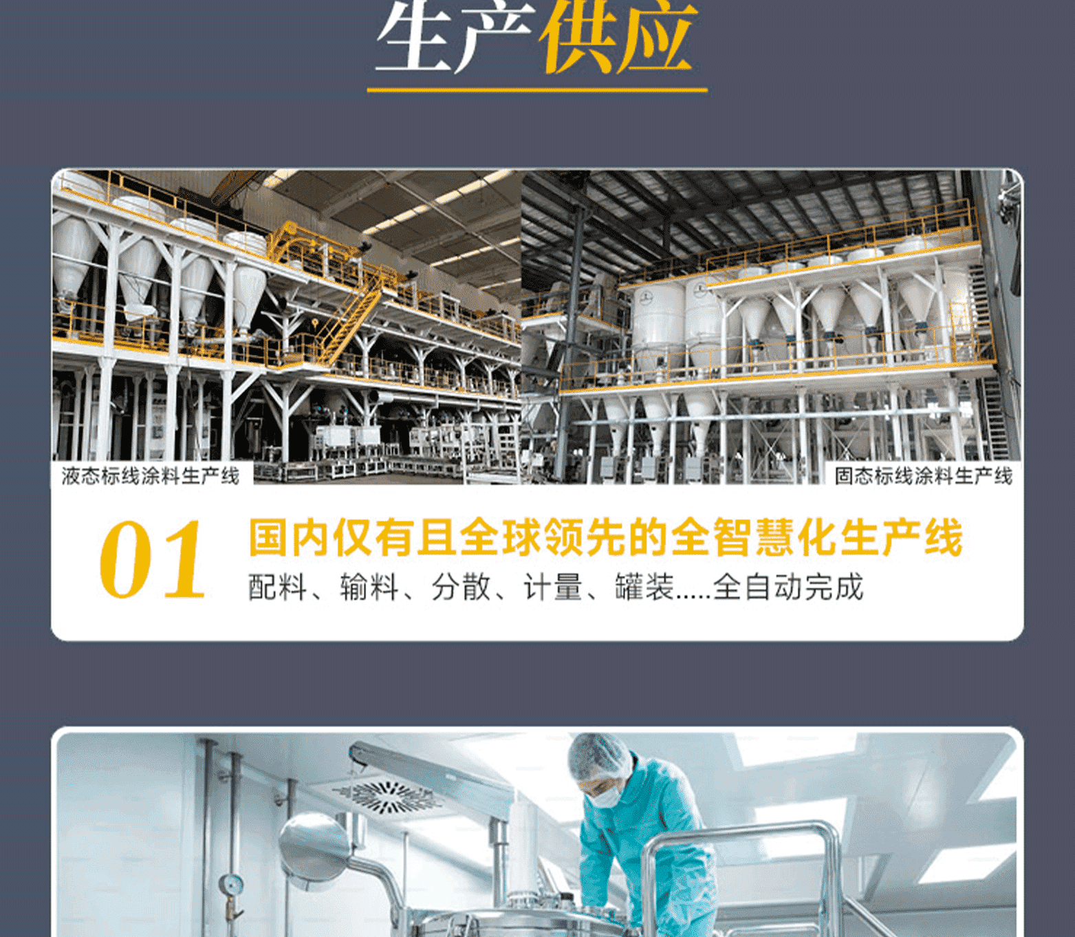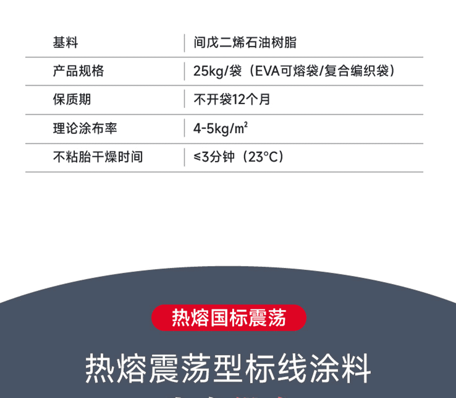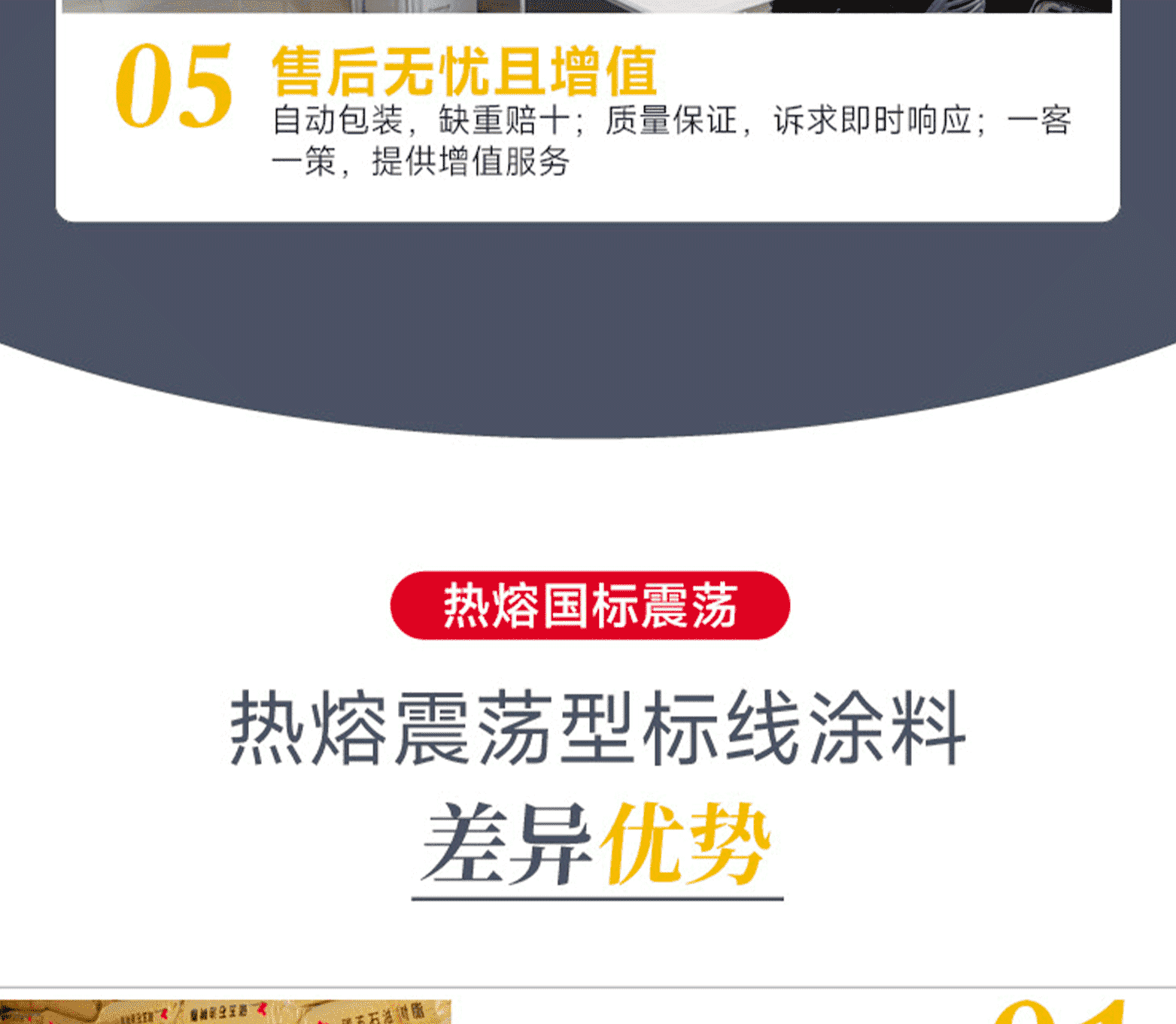 涂料特點:結構密實不開裂,抗壓耐磨不黃變、卓越的識認性、對路面玻璃珠粘接力強。標線特點:表面平滑顏色鮮艷;密實耐磨反光好;不龜裂、不黃變,質量免檢;標線壽命長,是常規熱熔標線的1.6倍。