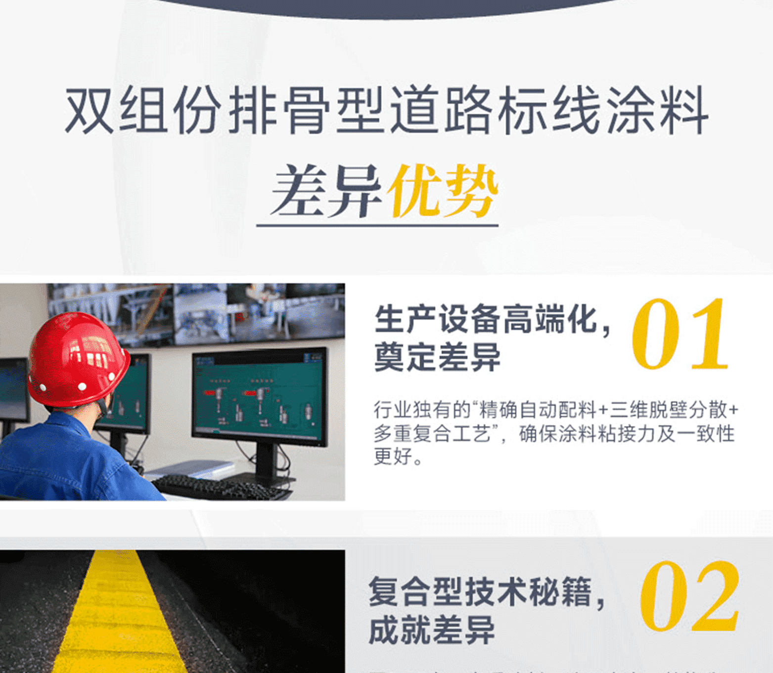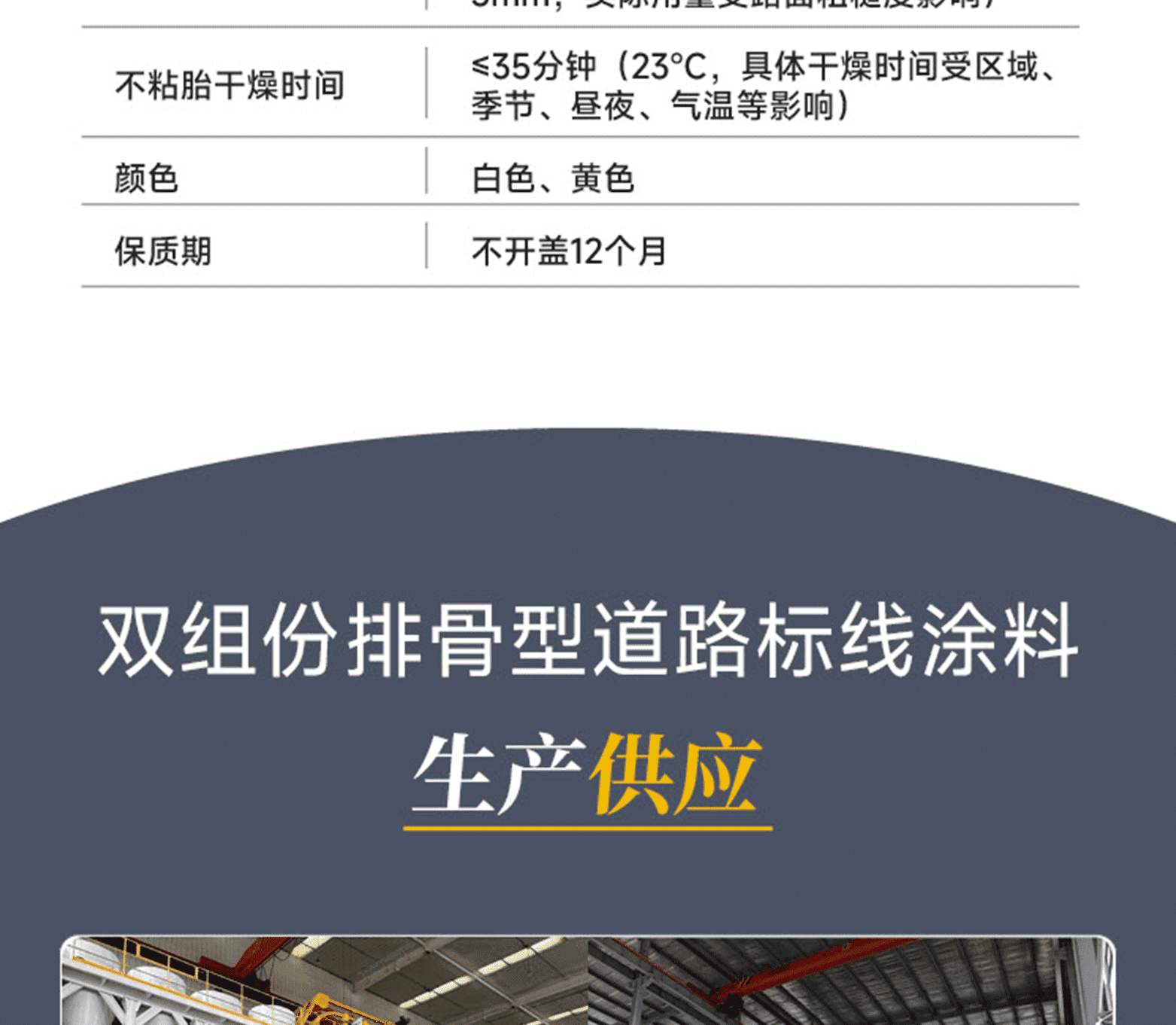 標線品質:進口基料、氯化鈦白/有機黃顏料、多重進口助劑、復合工藝、標準化檢測;標線特點:涂料細膩、抗污性強、覆蓋性高、耐磨耐候、施工性好、抗沉不起泡;