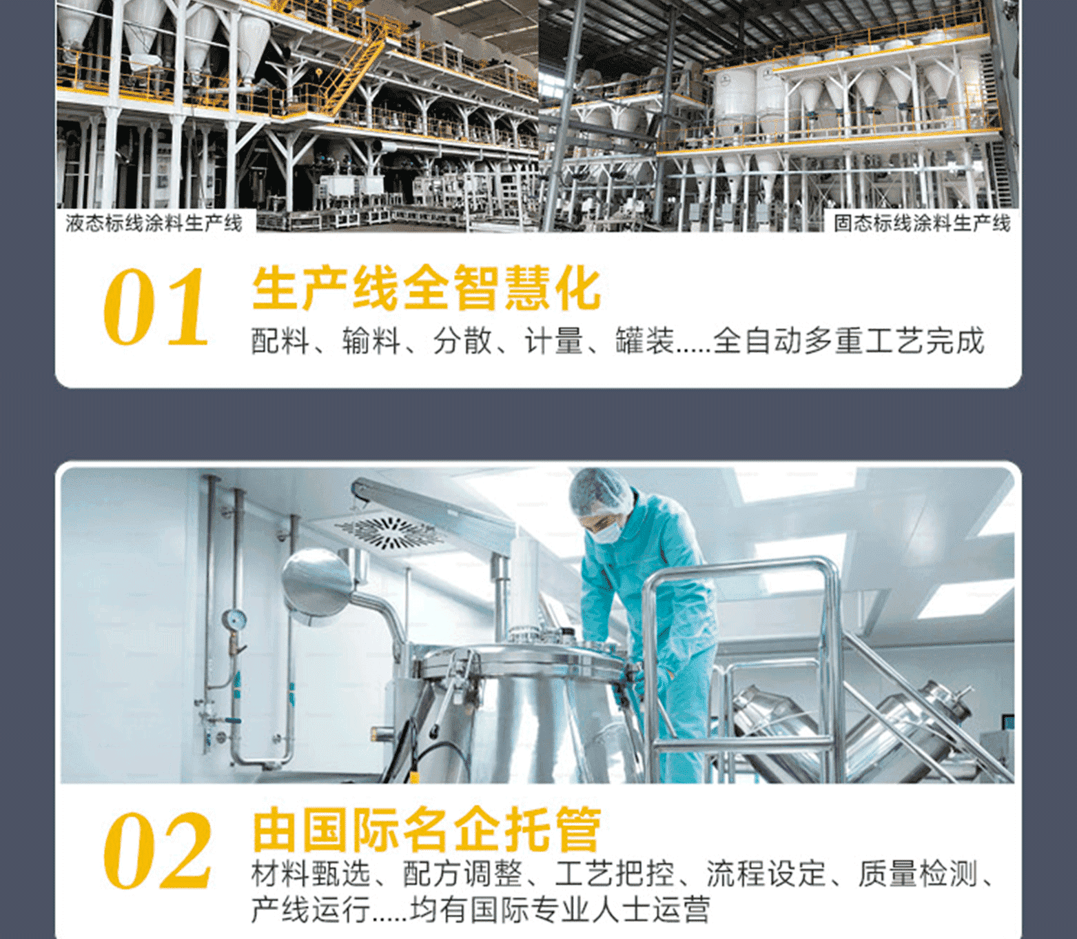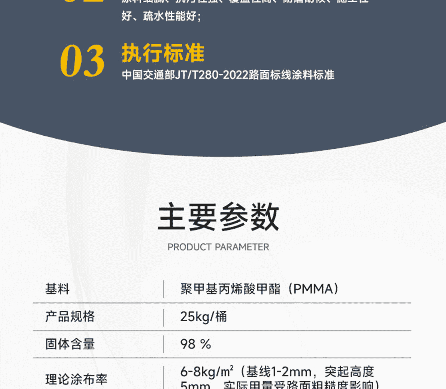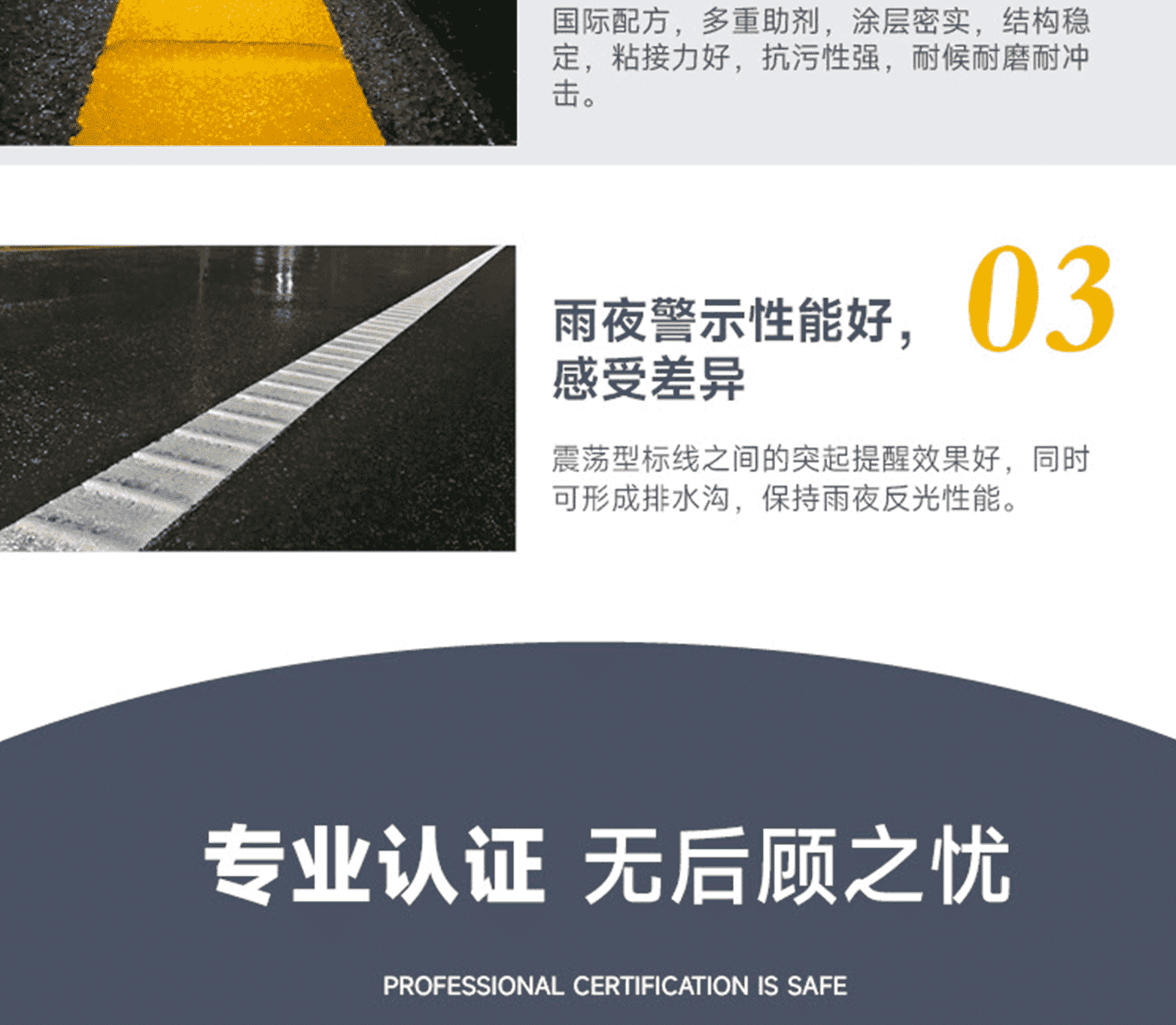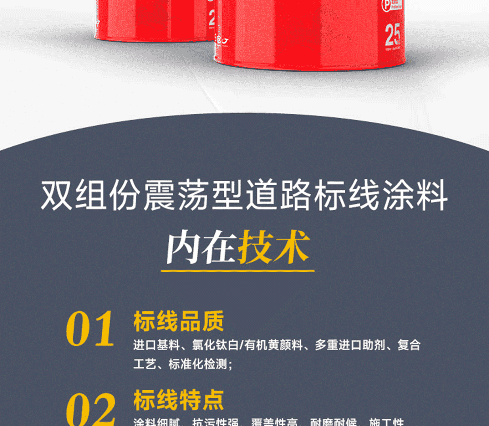 標線品質:進口基料、氯化鈦白/有機黃顏料、多重進口助劑、復合工藝、標準化檢測;標線特點:涂料細膩、抗污性強、覆蓋性高、耐磨耐候、施工性好、抗沉不起泡;